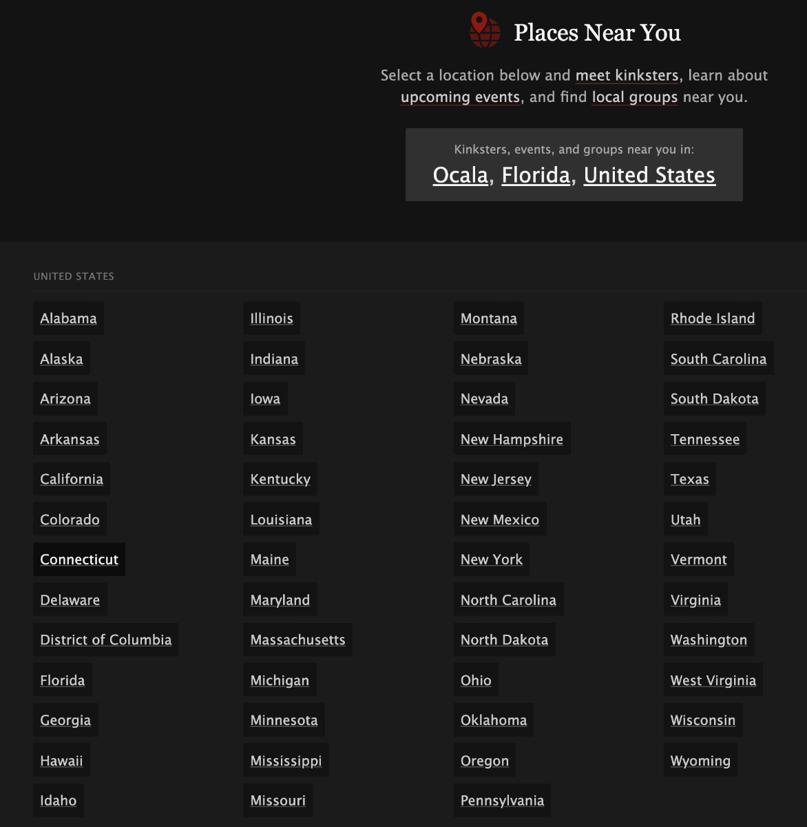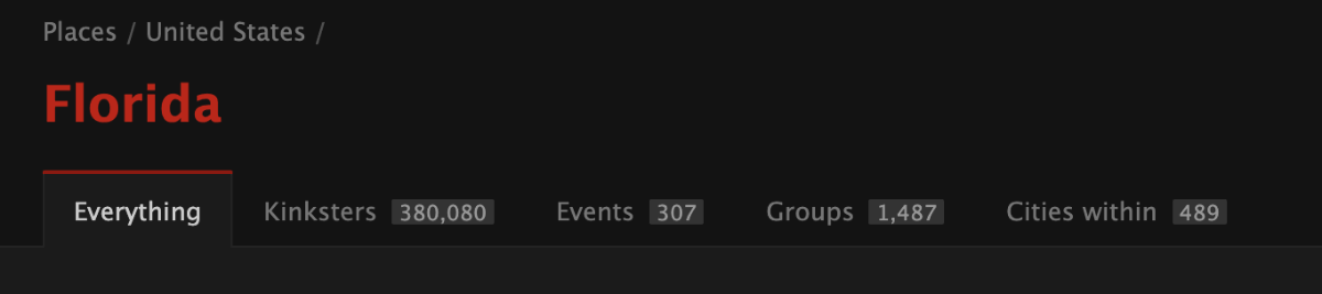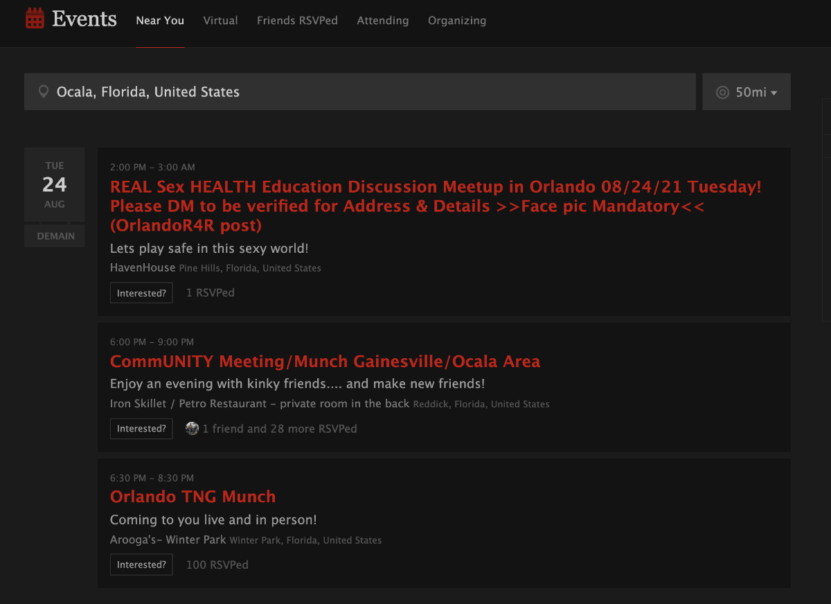 Some of the information is pulled from Fetlife but some organizers also add their events organically. Like Fetlife, you can search for events around the world (it’s not just US-based), but in the United States, you can see what’s available in your state. When I clicked on Florida, this is what I found: